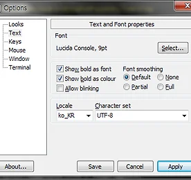Cygwin 설정 Cygwin은 윈도우에서 Linux의 터미널을 쓸 수 있도록 해주는 GNU의 프로그램으로 유명합니다.다운로드 및 설치는 Cygwin 다운로드 및 설치 (http://zeany.net/15)를 참조하세요. 설치가 완료되면 특별한 설정 없이도 바로 사용할 수 있으나 아주 약간 부족하여 그에 대한 설명을 남깁니다. 1. 화면 크기 조정 기본 화면의 크기는 80x24 정도로 되어 있는데, 작업을 하기에는 좀 답답합니다.물론 마우스로 윈도우 크기를 조정할 수 있으나 매번 실행마다 하는 것보다 한 번 설정해 놓는 것이 편합니다. 1) 타이틀 부분에서 마우스 오른쪽 버튼을 클릭한 후 Options... 을 클릭합니다. 2) 좌측 메뉴의 Window 선택 후 Columns과 Rows를 원하는 값으로 변경한 후 Save.. 더보기 이전 1 ··· 24 25 26 27 28 29 30 ··· 49 다음