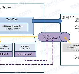 안드로이드 Native와 WebView 연동 (2) 이번 글에서는 WebView의 데이터를 Native로 넘기는 방법을 알아보겠습니다.기본 개념은 웹 페이지에서 호출할 수 있는 함수를 정의해서 웹 페이지에서 그 함수를 호출할 수 있도록 하는 것입니다. 네이티브에서 할 일은 WebView의 addJavascriptInterface() 메소드를 통해서 Object 객체와 String을 넘기는 것입니다.여기서 String은 자바스크립트에서 호출할 클래스 이름이다.Object 객체의 메소드 이름은 자바스크립트에서 호출할 메소드 이름과 동일하다.젤리빈 (JellyBean)부터 메소드는 @JavascriptInterface annotation을 갖는 public 메소드 이어야 한다. 자세한 설명은 안드로이드 공식 홈페이지 를 참조하세요. 이상을 그림으로 그려보면 다.. 더보기 이전 1 ··· 37 38 39 40 41 42 43 ··· 49 다음